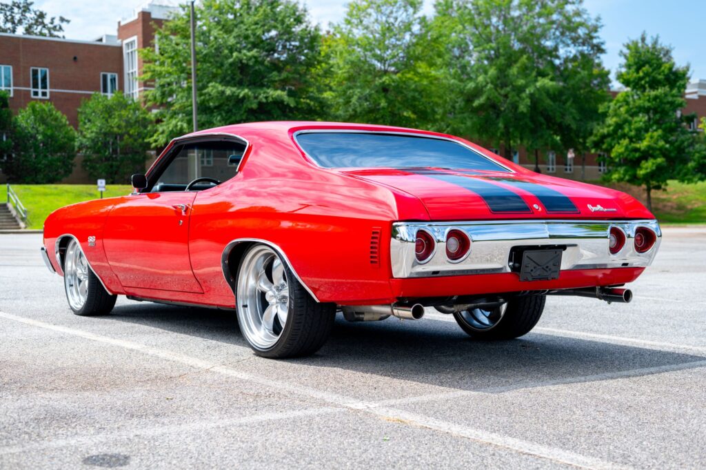 Right-rear perspective displaying the Chevelle’s wide muscular stance, polished chrome accents, and classic SS design that define true vintage performance.
