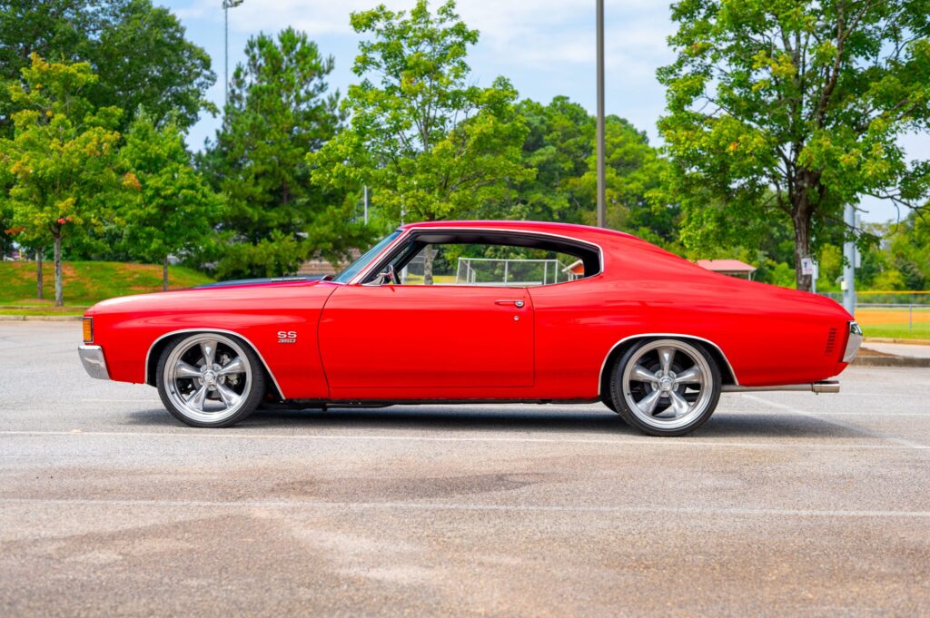 Classic side profile highlighting the Chevelle’s long, sleek body lines and timeless American muscle stance.
